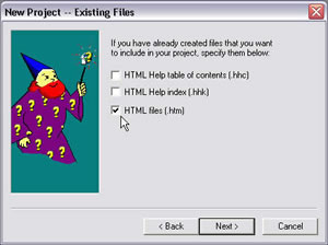 3. Check the option for HTML files to include the existing html files :